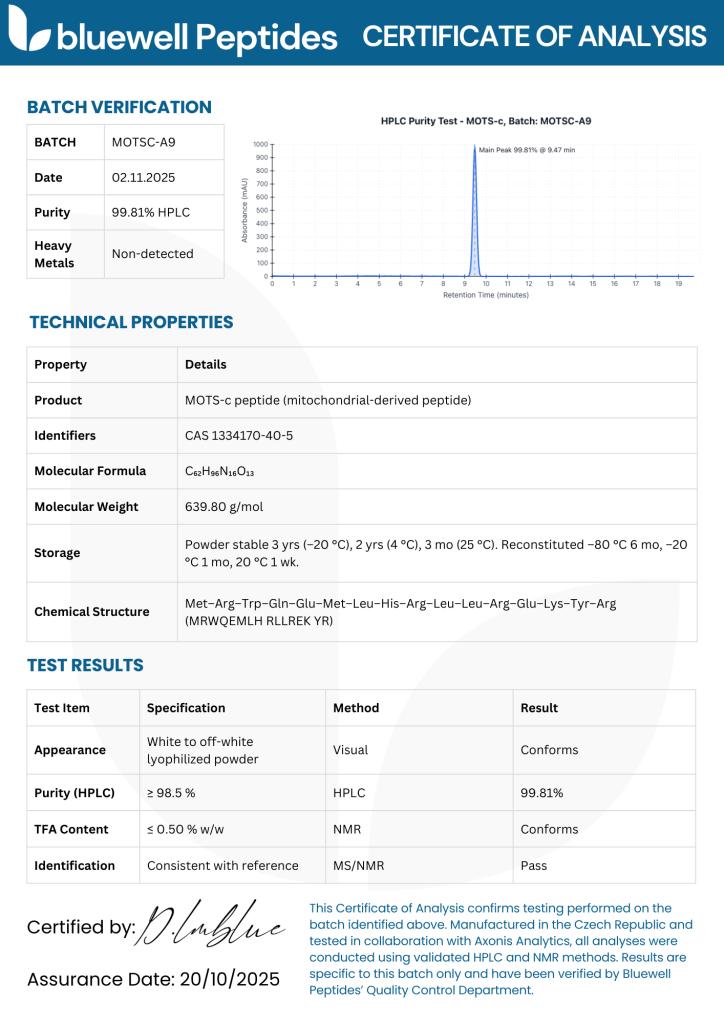 MOTS-c (Mitochondrial Open Reading Frame of the 12S rRNA type-c) is a mitochondria-derived peptide studied for its potential role in cellular metabolism, mitochondrial regulation, and metabolic balance. Supplied in lyophilised form to preserve stability, this peptide is verified at >99.1% purity (HPLC-tested) and provided with full Certificates of Analysis (COAs).